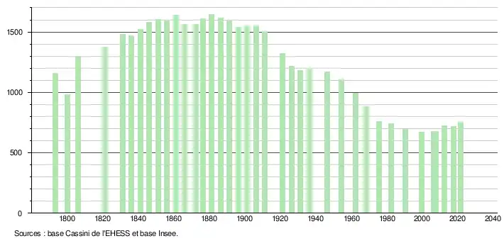 L'évolution du nombre d'habitants est connue à travers les recensements de la population effectués dans la commune depuis 1793. Pour les communes de moins de 10 000 habitants, une enquête de recensement portant sur toute la population est réalisée tous les cinq ans, les populations légales des années intermédiaires étant quant à elles estimées par interpolation ou extrapolation[29]. Pour la commune, le premier recensement exhaustif entrant dans le cadre du nouveau dispositif a été réalisé en 2007[30].