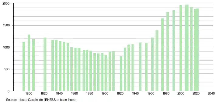 L'évolution du nombre d'habitants est connue à travers les recensements de la population effectués dans la commune depuis 1793. Pour les communes de moins de 10 000 habitants, une enquête de recensement portant sur toute la population est réalisée tous les cinq ans, les populations légales des années intermédiaires étant quant à elles estimées par interpolation ou extrapolation[21]. Pour la commune, le premier recensement exhaustif entrant dans le cadre du nouveau dispositif a été réalisé en 2008[22].