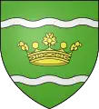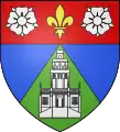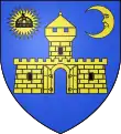 Blason | De gueules à la fasce ondée d'argent accompagnée en chef d'une forteresse crénelée sommée d'une tourelle crénelée et couverte d'or, maçonnée de sable, ouverte d'azur, et en pointe d'un château crénelé sommé de trois tourelles crénelées et couvertes d'or, ouvert de deux portes d'azur |