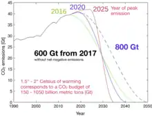 La découverte d'une relation presque linéaire entre l'élévation de la température mondiale et les émissions cumulatives de dioxyde de carbone[8] a encouragé l'estimation des budgets d'émissions globales afin de rester en dessous de niveaux dangereux de réchauffement. De la période pré-industrielle à 2011, environ 1 890 gigatonnes de CO2 ont été émises au niveau mondial, et 2 050 Gt jusqu'en 2015[10].