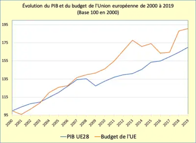 L'UE ne prélève directement aucun impôt. Ses ressources budgétaires sont donc des contributions versées par les États membres. La principale d'entre elles, dite « ressource RNB », est basée sur le poids économique de chacun d'eux. Elle représente selon les années entre les deux tiers et les trois quarts des ressources totales du budget. Les autres sources de financement sont des ressources propres traditionnelles (principalement des droits de douane), une fraction de la TVA perçue par les États membres ainsi que des amendes et taxes diverses. L'Allemagne est le premier contributeur au budget européen, suivie de la France et de l'Italie.