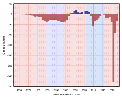 Après un dernier budget excédentaire en 1969-70 le déficit se creuse massivement vers le milieu des années 1970, notamment en 1975-76 alors qu'il triple par rapport à l'année précédente pour atteindre 6 milliards de dollars[1].