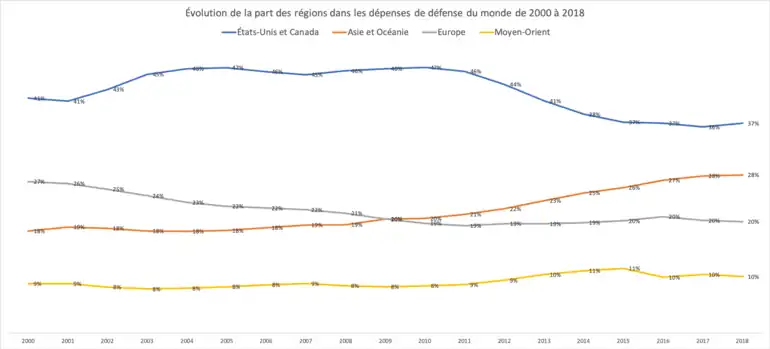 L'évolution la plus spectaculaire est l'inversion du poids respectif de l'Asie et de l'Europe entre 2000 et 2018 : en 2000, l'Europe et l'Asie représentent respectivement 27 % et 18 % des dépenses de défense mondiales. En 2018, ces rapports sont inversés, l'Asie en représente 28 % et l'Europe 20 %.