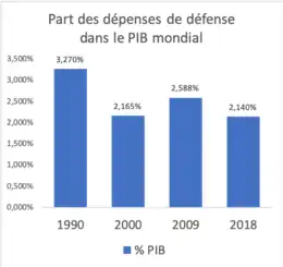 Toutefois, l'analyse du niveau des dépenses de défense dans le monde doit aussi tenir compte de l'évolution de la richesse mondiale. De ce point de vue, la part du produit intérieur brut que les États consacrent à la défense est l'indicateur le plus répandu pour mesurer l'intensité de l'effort de défense. Selon les données publiées par la SIPRI, dans les années 1960, le monde consacre de 5 à 6 % de son produit mondial brut aux dépenses de défense, dans les années 1970, de 4,87 à 3,5 %, en 1990, à la fin de la guerre froide, la part est de 3,27 %. Ce chiffre baisse de façon continue jusqu'en 2000, mais les conflits qui éclatent au début du XXIe siècle conduisent à une hausse de ces dépenses jusqu'en 2009. Celles-ci repartent les années suivantes à la baisse pour atteindre un point bas historique en 2018 où elles représentent 2,141 % du produit mondial brut[2].