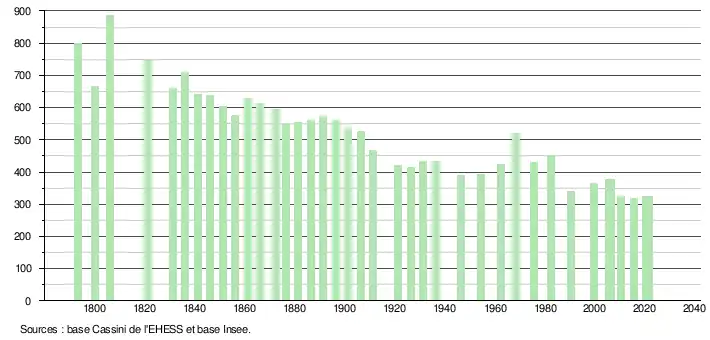 L'évolution du nombre d'habitants est connue à travers les recensements de la population effectués dans la commune depuis 1793. Pour les communes de moins de 10 000 habitants, une enquête de recensement portant sur toute la population est réalisée tous les cinq ans, les populations légales des années intermédiaires étant quant à elles estimées par interpolation ou extrapolation[32]. Pour la commune, le premier recensement exhaustif entrant dans le cadre du nouveau dispositif a été réalisé en 2005[33].