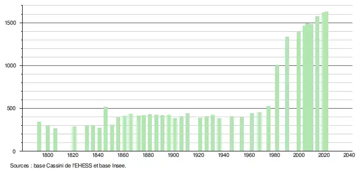 L'évolution du nombre d'habitants est connue à travers les recensements de la population effectués dans la commune depuis 1793. Pour les communes de moins de 10 000 habitants, une enquête de recensement portant sur toute la population est réalisée tous les cinq ans, les populations légales des années intermédiaires étant quant à elles estimées par interpolation ou extrapolation[20]. Pour la commune, le premier recensement exhaustif entrant dans le cadre du nouveau dispositif a été réalisé en 2004[21].
