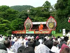 Amaterasu, la déesse du Soleil, s'est cachée dans une grotte parce qu'elle a été blessée par le comportement inacceptable de son frère Susanō. Près de l'entrée de la grotte, la déesse Ame-no-uzume retourne un baquet à bain et commence à danser dessus devant l'assemblée des dieux inquiets. Comme Ame-no-uzume est déjà à moitié nue avec les vêtements qui tombent, les dieux se mettent à rire bruyamment. Lorsque Amaterasu entend cette agitation, elle sort pour voir ce qui se passe. Le monde retrouve ainsi la lumière du Soleil. La famille impériale du Japon descend dit-on d'Amaterasu et Ame-no-Uzume est considérée comme la déesse patronne de la musique et la danse.