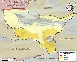 Le retrait-gonflement des sols argileux est susceptible d'engendrer des dommages importants aux bâtiments en cas d’alternance de périodes de sécheresse et de pluie. 31,1 % de la superficie communale est en aléa moyen ou fort (75,2 % au niveau départemental et 48,5 % au niveau national). Sur les 177 bâtiments dénombrés sur la commune en 2019, 5 sont en aléa moyen ou fort, soit 3 %, à comparer aux 94 % au niveau départemental et 54 % au niveau national. Une cartographie de l'exposition du territoire national au retrait gonflement des sols argileux est disponible sur le site du BRGM[35],[Carte 3].