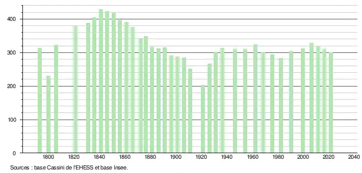 L'évolution du nombre d'habitants est connue à travers les recensements de la population effectués dans la commune depuis 1793. Pour les communes de moins de 10 000 habitants, une enquête de recensement portant sur toute la population est réalisée tous les cinq ans, les populations légales des années intermédiaires étant quant à elles estimées par interpolation ou extrapolation[23]. Pour la commune, le premier recensement exhaustif entrant dans le cadre du nouveau dispositif a été réalisé en 2006[24].
