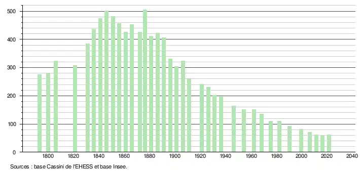 L'évolution du nombre d'habitants est connue à travers les recensements de la population effectués dans la commune depuis 1793. Pour les communes de moins de 10 000 habitants, une enquête de recensement portant sur toute la population est réalisée tous les cinq ans, les populations légales des années intermédiaires étant quant à elles estimées par interpolation ou extrapolation[37]. Pour la commune, le premier recensement exhaustif entrant dans le cadre du nouveau dispositif a été réalisé en 2006[38].