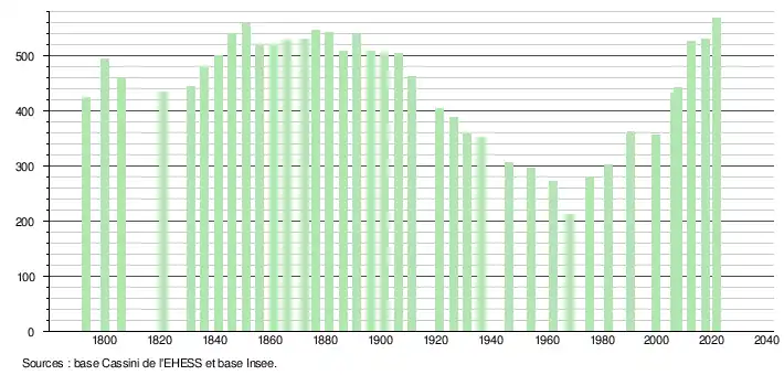 L'évolution du nombre d'habitants est connue à travers les recensements de la population effectués dans la commune depuis 1793. Pour les communes de moins de 10 000 habitants, une enquête de recensement portant sur toute la population est réalisée tous les cinq ans, les populations légales des années intermédiaires étant quant à elles estimées par interpolation ou extrapolation[24]. Pour la commune, le premier recensement exhaustif entrant dans le cadre du nouveau dispositif a été réalisé en 2007[25].