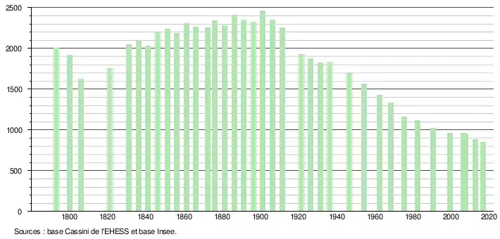 L'évolution du nombre d'habitants est connue à travers les recensements de la population effectués dans la commune depuis 1793. Pour les communes de moins de 10 000 habitants, une enquête de recensement portant sur toute la population est réalisée tous les cinq ans, les populations légales des années intermédiaires étant quant à elles estimées par interpolation ou extrapolation[7]. Pour la commune, le premier recensement exhaustif entrant dans le cadre du nouveau dispositif a été réalisé en 2007[8].