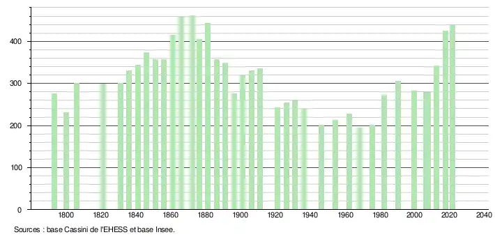 L'évolution du nombre d'habitants est connue à travers les recensements de la population effectués dans la commune depuis 1793. Pour les communes de moins de 10 000 habitants, une enquête de recensement portant sur toute la population est réalisée tous les cinq ans, les populations légales des années intermédiaires étant quant à elles estimées par interpolation ou extrapolation[18]. Pour la commune, le premier recensement exhaustif entrant dans le cadre du nouveau dispositif a été réalisé en 2007[19].