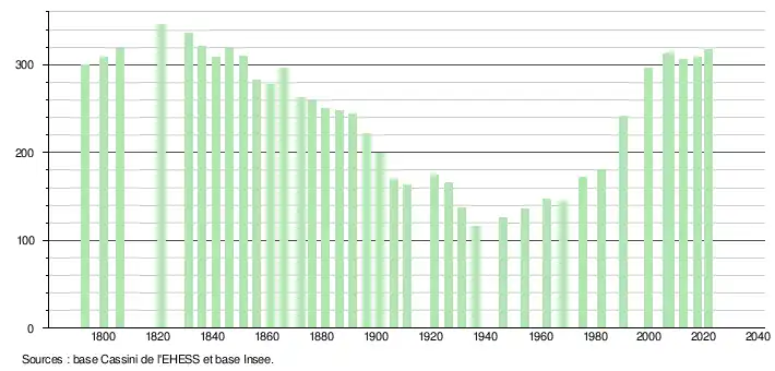 L'évolution du nombre d'habitants est connue à travers les recensements de la population effectués dans la commune depuis 1793. Pour les communes de moins de 10 000 habitants, une enquête de recensement portant sur toute la population est réalisée tous les cinq ans, les populations légales des années intermédiaires étant quant à elles estimées par interpolation ou extrapolation[17]. Pour la commune, le premier recensement exhaustif entrant dans le cadre du nouveau dispositif a été réalisé en 2007[18].