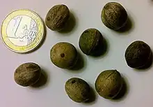 - Les fruits sont orange à maturité et contiennent une graine brune de la taille d'une petite noisette sur laquelle après nettoyage de la pulpe, on peut voir trois "yeux" noirs. Toutes les graines de cette sous-famille des Arecoideae (Butia, Cocos, Syagrus, Jubaea, Parajubaea, Jubaeopsis, Voanioala) ont cette caractéristique. Techniquement, trois plantes peuvent germer de cette graine (Polyembryonie) mais cela arrive rarement[réf. souhaitée]. En dehors de son climat chaud, les graines de Butia peuvent avoir besoin de plusieurs mois pour germer. Pour faciliter la germination, il est recommandé de bien nettoyer la graine puis la laisser une dizaine de jours dans l'eau (en changeant l'eau chaque jour) pour ramollir sa coque avant de la semer en environnement chaud (30 °C) et humide. En posant le pot sur un radiateur, on peut obtenir une germination en 3 mois. On constate également une germination rapide en mettant la graine dans un peu de sphaigne humide à l'intérieur d'un sac de congélation fermé et posé sur un endroit chaud (dessus de réfrigérateur ou radiateur).