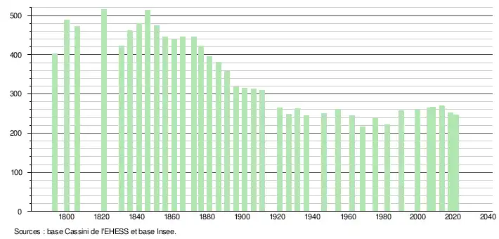L'évolution du nombre d'habitants est connue à travers les recensements de la population effectués dans la commune depuis 1793. Pour les communes de moins de 10 000 habitants, une enquête de recensement portant sur toute la population est réalisée tous les cinq ans, les populations légales des années intermédiaires étant quant à elles estimées par interpolation ou extrapolation[15]. Pour la commune, le premier recensement exhaustif entrant dans le cadre du nouveau dispositif a été réalisé en 2008[16].