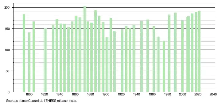 L'évolution du nombre d'habitants est connue à travers les recensements de la population effectués dans la commune depuis 1793. Pour les communes de moins de 10 000 habitants, une enquête de recensement portant sur toute la population est réalisée tous les cinq ans, les populations légales des années intermédiaires étant quant à elles estimées par interpolation ou extrapolation[20]. Pour la commune, le premier recensement exhaustif entrant dans le cadre du nouveau dispositif a été réalisé en 2007[21].