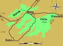 La cédraie du Chélia se situe dans le plus haut sommet de l'Aurès (à 2 328 m d'altitude) au sud-est de la ville de Batna, les forêts commencent de la commune de Chélia[13] jusqu'à Moussa-El-Ayati, encerclent Ain Mimoun, en passent sur djebel Faraoun et finissent aux abords de Chentgouma[14], sur une superficie totale de 7 000 ha avec des précipitations annuelles de 700 à 790 mm[11]. Les arbres qui se situent au sud du djebel Chélia au lieu-dit Oued Tidder à une altitude moyenne de 1 860 m, ont un diamètre moyen qui avoisine les 80 cm avec une hauteur moyenne de plus de 30 m âgés jusqu’à 150 ans[15].