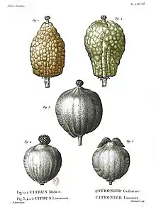 Cédrat de Chine - cédratier à fruits sillonnés, décrit par Volkamer «fruits de moyenne grosseur, allongés en cône, terminés par un mamelon pointu, marqués dans leur longueur de profonds sillons et relevés de côtes verruqueuses».
