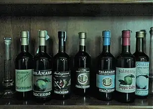 - Liqueurs de cédrat : liqueur corse: la cédratine, liqueurs italiennes: Il cedro, Acqua di cedro (infusion de cédrat 29°)[57], Liquore al cedro de la Riviera dei Cedri (un limoncello de cédrat)[58], liqueur Salò (qui donne l'acqua di cedro - la Cedrinca et la Cedral Tassoni -[59]; liqueur grecque: Κίτρον Νάξου / Kitron Naxou Cédrat de Naxos (existe en couleur verte, en jaune et en intermédiaire, à base de fruits et de feuilles de cédrat[60], elle est distillée depuis 1896 à Halki[61]).
