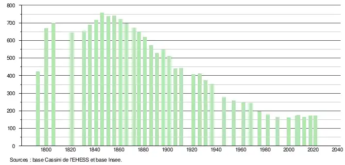 L'évolution du nombre d'habitants est connue à travers les recensements de la population effectués dans la commune depuis 1793. Pour les communes de moins de 10 000 habitants, une enquête de recensement portant sur toute la population est réalisée tous les cinq ans, les populations légales des années intermédiaires étant quant à elles estimées par interpolation ou extrapolation[27]. Pour la commune, le premier recensement exhaustif entrant dans le cadre du nouveau dispositif a été réalisé en 2007[28].