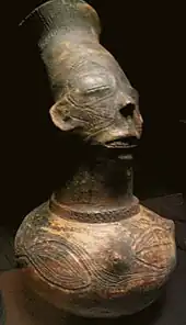 • poteries figuratives : elles associent un récipient fermé de forme sphérique et un couronnement sculpté. Les motifs font appel à un registre zoomorphe : batraciens, félins, bovidés (ethnie Tikar, Cameroun) ou anthropomorphe : personnages à deux têtes ou visages surmontés d’une coiffe tubulaire (pays Mangbetu, République démocratique du Congo)[5] ;