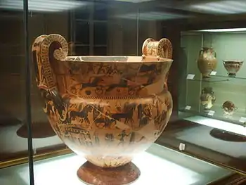 C'est aussi l'influence de Corinthe qui introduit à Athènes de nouvelles formes de vases (coupe, cratère) mais aussi des frises narratives. À la fin de cette période (635-570), la représentation de frise animale touche à sa fin.