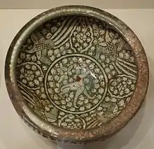 - Première moitié du XIVe siècle , céramique siliceuse, engobée et peinte sous glaçure, hauteur 12 cm, diamètre 25.3 cm, Inventaire : OA 8177.