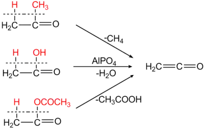 La principale voie de synthèse du cétène est la pyrolyse de l'acide acétique. Ce dernier est évaporé et chauffé à une température de 740 à 760 °C, puis du phosphate de triéthyle est ajouté comme catalyseur ainsi que de l'ammoniaque. L'ammoniaque empêche la recombinaison de l'eau et du cétène. Le mélange est ensuite refroidi à moins de 100 °C pour condenser l'eau et l'acide acétique n'ayant pas réagi, le cétène est alors absorbé dans un liquide de conditionnement ou récupéré sous forme de dicétène via une pompe à vide[3].