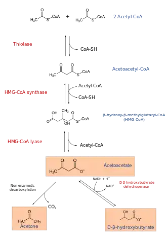 - Une troisième molécule d'acétyl-CoA est condensée sur l'acétoacétyl-CoA par HMG-CoA synthase pour donner de l'HMG-CoA. Ce composé est également un précurseur du cholestérol et des hormones stéroïdiennes, par la voie du mévalonate.