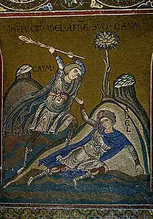 D'après le récit biblique de Caïn et Abel, Caïn est le fils aîné d'Adam et Ève. Il est paysan et a un frère, Abel, qui est berger. Un jour, les deux frères apportent chacun une offrande à Dieu : Caïn offre des fruits de la terre, tandis qu'Abel présente des premiers-nés de son troupeau de moutons et leur graisse. Dieu préfère ostensiblement l'offrande d'Abel. Puis il perçoit la colère et la tristesse de Caïn, et lui enjoint de bien agir et de dominer le péché[7]. Mais Caïn, jaloux, échoue. Un peu plus tard, il invite son frère à sortir dans les champs, se jette sur lui et le tue. C'est le premier meurtre inscrit dans la Bible.