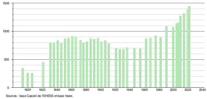 L'évolution du nombre d'habitants est connue à travers les recensements de la population effectués dans la commune depuis 1793. Pour les communes de moins de 10 000 habitants, une enquête de recensement portant sur toute la population est réalisée tous les cinq ans, les populations légales des années intermédiaires étant quant à elles estimées par interpolation ou extrapolation[17]. Pour la commune, le premier recensement exhaustif entrant dans le cadre du nouveau dispositif a été réalisé en 2004[18].