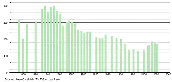 L'évolution du nombre d'habitants est connue à travers les recensements de la population effectués dans la commune depuis 1793. Pour les communes de moins de 10 000 habitants, une enquête de recensement portant sur toute la population est réalisée tous les cinq ans, les populations légales des années intermédiaires étant quant à elles estimées par interpolation ou extrapolation[37]. Pour la commune, le premier recensement exhaustif entrant dans le cadre du nouveau dispositif a été réalisé en 2008[38].