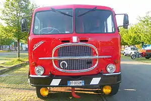 Cette cabine lancée en 1955 est de type avancé avec sur sa face avant la barre transversale chromée caractéristique qui coupe horizontalement la calandre à barreaux chromés verticaux. Certains l'ont baptisée le camion qui rit. Une autre caractéristique typique des camions italiens de l'époque, la position des essuie glaces, fixés au-dessus du pare-brise. L’intérieur de la cabine était très bien organisé avec, au centre le capot isolé couvrant le moteur, le poste de conduite à droite, et le fauteuil du passager à gauche avec appuie-tête intégré. À l'arrière se trouvait, sur les versions longs courriers, un ou 2 lits superposés selon les règles de l'époque, pour limiter la durée de la conduite et assurer la sécurité des deux chauffeurs. Le tableau de bord, derrière le volant et face au chauffeur constitué d'une plaque métallique regroupait le compteur de vitesses avec compteur kilométrique journalier et total et le compte-tours circulaire plus les témoins lumineux des feux de croisement et de route, le rappel des clignotants, le témoin du frein de stationnement et le contrôle du compresseur d'air comprimé des freins. Il y avait le levier de vitesses qui comprenait 4 rapports avant et la marche arrière plus un levier pour les demi-vitesses. Sur cette première version, un levier permettait d'actionner manuellement le frein moteur en agissant directement sur les soupapes d'échappement afin de ne pas abuser des freins à tambours de service. Un autre petit levier était l'accélérateur à main, pour le maintien du régime en phase de démarrage par grand froid.