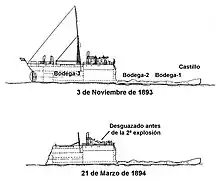 Une heure plus tard, les deux cales de la proue explosent[1], produisant une grande trombe d'eau de plusieurs milliers de tonnes qui entraîne plusieurs personnes à la mer[6]. L'onde expansive se propage dans toute la baie, certains des bâtiments les plus proches s'écroulent et des centaines de fragments de fer sont ejectés à plusieurs kilomètres de distance[1]. La magnitude de l'explosion est telle que selon certains témoignages, un gros bout a atterri sur la commune de Peñacastillo (es), située à 4,7 km de là, tuant une personne[6].Tous ceux qui étaient à bord, parmi lesquels les 32 membres de l'équipage de l'Alfonso XIII et son capitaine, Francisco Jaureguizar, sont morts dans l'explosion.