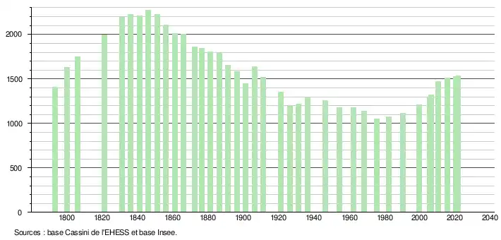 L'évolution du nombre d'habitants est connue à travers les recensements de la population effectués dans la commune depuis 1793. Pour les communes de moins de 10 000 habitants, une enquête de recensement portant sur toute la population est réalisée tous les cinq ans, les populations légales des années intermédiaires étant quant à elles estimées par interpolation ou extrapolation[33]. Pour la commune, le premier recensement exhaustif entrant dans le cadre du nouveau dispositif a été réalisé en 2005[34].
