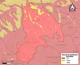 La commune est vulnérable au risque de mouvements de terrains constitué principalement du retrait-gonflement des sols argileux[26]. Cet aléa est susceptible d'engendrer des dommages importants aux bâtiments en cas d’alternance de périodes de sécheresse et de pluie. La totalité de la commune est en aléa moyen ou fort (76,3 % au niveau départemental et 48,5 % au niveau national). Sur les 667 bâtiments dénombrés sur la commune en 2019, 667 sont en aléa moyen ou fort, soit 100 %, à comparer aux 90 % au niveau départemental et 54 % au niveau national. Une cartographie de l'exposition du territoire national au retrait gonflement des sols argileux est disponible sur le site du BRGM[27],[Carte 2].