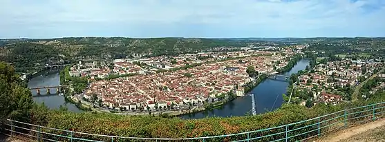 La ville de Cahors a la particularité d'être une presqu'île. La barre de relief, constituée par l’isthme de la boucle du Lot, s’apparente en effet à un pont supplémentaire. Le relief extrêmement accentué est la donnée majeure du site de Cahors. Le site construit de Cahors a pris possession du site naturel et lui a donné sa forme urbaine originale.