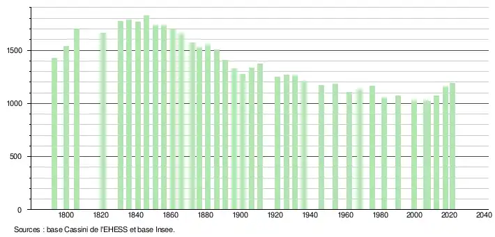 L'évolution du nombre d'habitants est connue à travers les recensements de la population effectués dans la commune depuis 1793. Pour les communes de moins de 10 000 habitants, une enquête de recensement portant sur toute la population est réalisée tous les cinq ans, les populations légales des années intermédiaires étant quant à elles estimées par interpolation ou extrapolation[31]. Pour la commune, le premier recensement exhaustif entrant dans le cadre du nouveau dispositif a été réalisé en 2007[32].