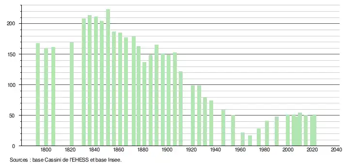 L'évolution du nombre d'habitants est connue à travers les recensements de la population effectués dans la commune depuis 1793. Pour les communes de moins de 10 000 habitants, une enquête de recensement portant sur toute la population est réalisée tous les cinq ans, les populations légales des années intermédiaires étant quant à elles estimées par interpolation ou extrapolation[37]. Pour la commune, le premier recensement exhaustif entrant dans le cadre du nouveau dispositif a été réalisé en 2004[38].