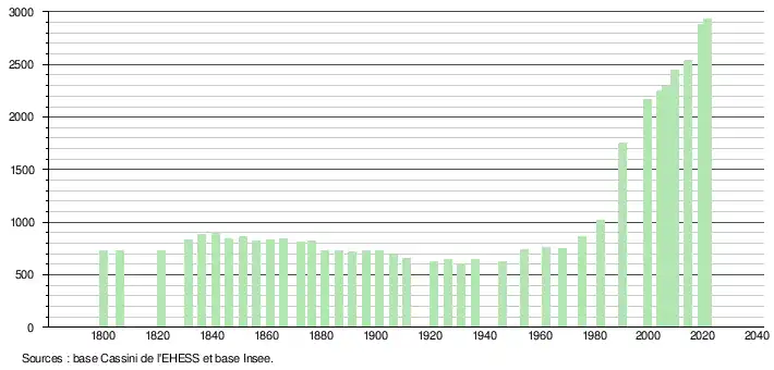 L'évolution du nombre d'habitants est connue à travers les recensements de la population effectués dans la commune depuis 1800. Pour les communes de moins de 10 000 habitants, une enquête de recensement portant sur toute la population est réalisée tous les cinq ans, les populations légales des années intermédiaires étant quant à elles estimées par interpolation ou extrapolation[23]. Pour la commune, le premier recensement exhaustif entrant dans le cadre du nouveau dispositif a été réalisé en 2004[24].