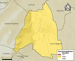 Le retrait-gonflement des sols argileux est susceptible d'engendrer des dommages importants aux bâtiments en cas d’alternance de périodes de sécheresse et de pluie. 99,8 % de la superficie communale est en aléa moyen ou fort (44,5 % au niveau départemental et 48,5 % au niveau national). Sur les 163 bâtiments dénombrés sur la commune en 2019, 163 sont en aléa moyen ou fort, soit 100 %, à comparer aux 75 % au niveau départemental et 54 % au niveau national. Une cartographie de l'exposition du territoire national au retrait gonflement des sols argileux est disponible sur le site du BRGM[22],[Carte 3].