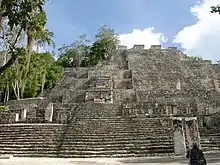 Calakmul (qui s'orthographie également Kalakmul, ainsi qu'avec d'autres variantes moins répandues) est le nom moderne de l'une des plus anciennes et des plus puissantes cités mayas découvertes dans les basses terres[1]. Elle est située sur les 7 200 km2 de la réserve de biosphère de Calakmul dans l’État mexicain de Campeche, au fond de la jungle de la grande région du bassin du Petén, au centre de la péninsule du Yucatán, à 35 km au nord de la frontière du Guatemala. Dans les temps anciens le cœur de la ville était connu sous le nom d’Ox Te' tuun[3]. Cette puissante cité maya fut habitée pendant plus d'un millénaire, avant d’être engloutie par la jungle après son abandon. À son apogée, Calakmul administrait un vaste domaine marqué par l’inscription largement répandue de son glyphe-emblème, qui est caractérisé par le signe de la tête de serpent[4] et qui se lisait Kaan[5]. Calakmul était le siège de ce que l'on a appelé le Royaume du Serpent[6]. Ce Royaume du Serpent a régné, comme Tikal, au cours de la plus grande partie de la période classique. On estime que Calakmul elle-même avait une population de 50 000 personnes et contrôlait des localités situés à une distance allant jusqu’à 150 km. Il existe 6 750 structures anciennes identifiées à Calakmul, dont la plus importante est la grande pyramide du site. La Structure 2 a plus de 45 m de haut, ce qui en fait une des plus hautes pyramides de la civilisation maya. Quatre tombes ont été localisées dans la pyramide. Comme de nombreux temples ou pyramides de Mésoamérique, la pyramide de Calakmul s’est agrandie en s'appuyant sur le temple existant pour atteindre sa taille actuelle[7]. La superficie de la zone centrale est d'environ 2 km2 et l'ensemble du site, couvert essentiellement d’un habitat résidentiel dense, est d'environ 20 km2.