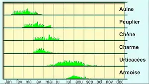 - d'attirer l'attention sur l'émergence de certains pollens émis par des espèces introduites (éventuellement invasives ou envahissantes telles que l'ambroisie en France[8]), dont on peut alors mieux suivre l'évolution locale en comparant des calendriers polliniques de différentes époques.