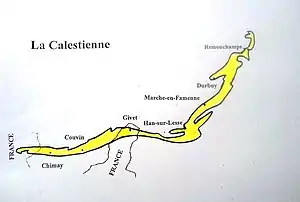 Elle recouvre au nord une bonne partie de la Fagne et de la Famenne, à l'ouest le Condroz et au sud et à l'est une partie de l'Ardenne. La Calestienne se caractérise par un relief marqué et la présence dans le sol de massifs calcaires coralliens mis en place dans les mers chaudes de l'ère primaire au (c'est-à-dire il y a ± 395 millions d'années, à une époque où la mer recouvrait cette région).