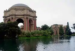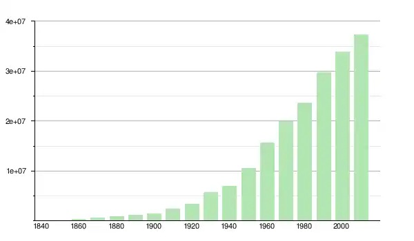 En 1849, la convention constituante de Monterey (en)[23] décide à l'unanimité d'interdire l'esclavage, met en place un gouvernement provisoire qui administre la région pendant dix mois et rédige la première Constitution de la Californie. Le 9 septembre 1850, la Californie devient le 31e État de l’Union, grâce au compromis de 1850. Durant la guerre de Sécession (1861-1865), le Golden State s’allie aux Nordistes. Pendant les années 1870-1890, le développement du chemin de fer permet à la Californie de se rattacher aux États de l'est. Le premier chemin de fer transcontinental est inauguré en 1869. Le réseau ferroviaire est complété par la Southern Pacific Railroad[24] et l'Atchison, Topeka and Santa Fe Railroad. San Francisco compte 70 000 habitants dès 1862 et la ville profite de la création de centaines de compagnies minières du Comstock Lode, dont les actions s'échangent sur la Bourse de San Francisco, produisant plusieurs millionnaires qui animent la vie politique et dotent la ville de bâtiments superbes pour l'époque : James Graham Fair, John William MacKay, James C. Flood et leur Banque du Nevada, Adolph Sutro, William Sharon et sa Bank of California ou encore John P. Jones et Alvinza Hayward.
