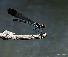 Les ailes sont hyalines avec le tiers extérieur totalement noir. Le bord de cette partie noire est droit et clairement dessiné. La partie noire ne présente pas de zone vitreuse et apparaît d'un bleu violet métallique aux reflets de la lumière. Les pterostigma sont noirs et placés très près de l'apex des ailes, si près qu'ils s'inscrivent dans la courbure de l'apex. Les ailes sont de même longueur et de même largeur, très étroites avec les apex nettement arrondis[1].