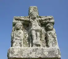 Une scène de Crucifixion, le Christ entouré de la Vierge et saint Jean, surmonte un fût octogonal. Elle est jugée « grossièrement taillée »[1].