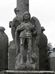 La croix du centre présente un fût à écots, excroissances symbolisant les bubons de la peste ou les branches coupées d'un arbre émondé. Au sommet deux anges recueillent le sang des mains clouées du Christ, entourés de part et d'autre par saint Jean et la Vierge. Entre ces deux personnages, deux anges élèvent un calice.