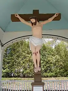 La croix est simple et en bois peint. Le Christ est une sculpture en pin blanc. Ce dernier est de grandeur nature et le fini polychrome lui confère un rendu réaliste[3].